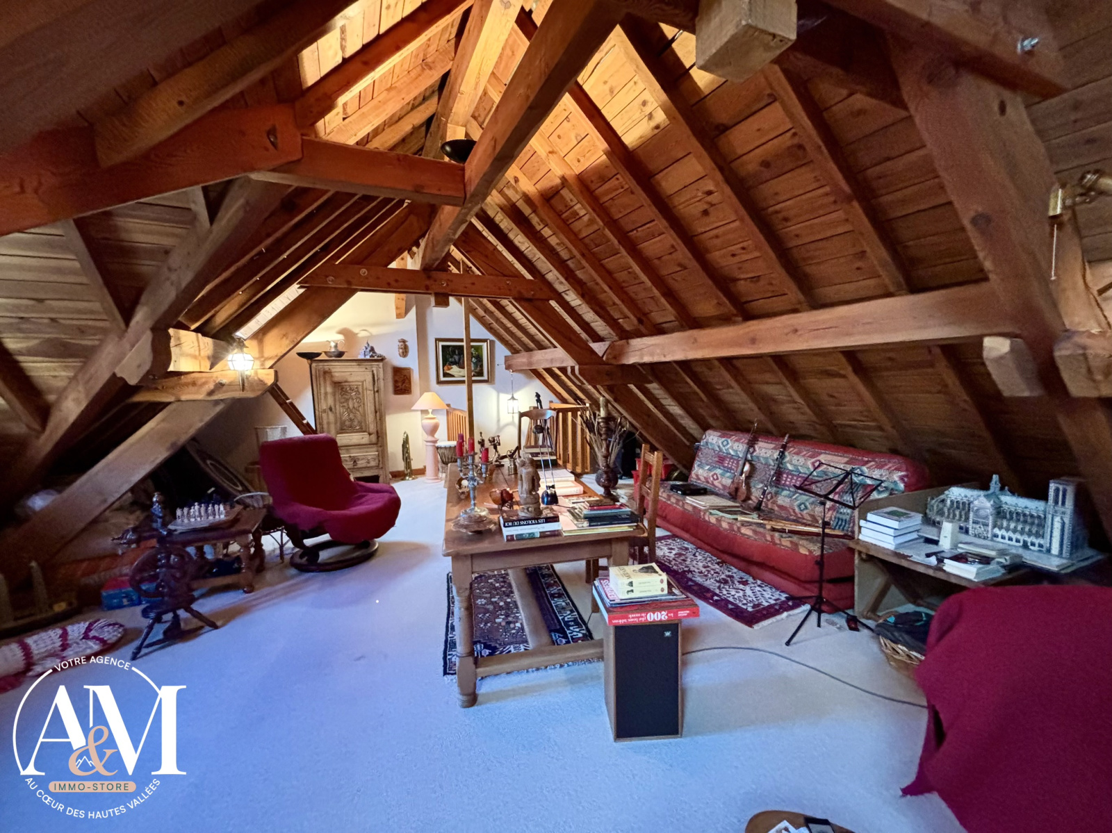 - Au dernier niveau, une grande pièce sous combles avec charpente apparente, idéale pour une suite parentale, un espace bureau ou une salle de loisirs.